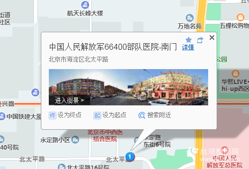 北京西站1.1公里向西步行 到 蓮花橋7站乘 420路 (吳莊方向) 到 永定路口東550米向南步行 到 中國人民解放軍66400部隊醫(yī)院-南門