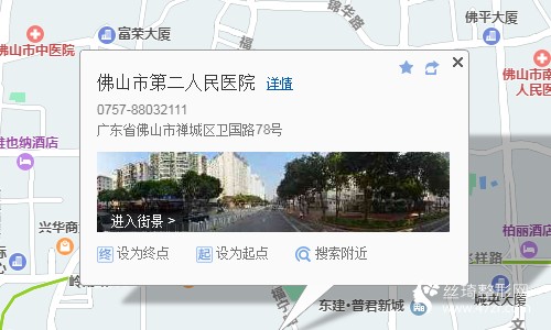 佛山站340米向東步行 到 火車站6站乘 122路 (奇槎公交樞紐站方向) 或118路 到 祖廟路1.1公里向東步行 到 佛山市第二人民醫(yī)院