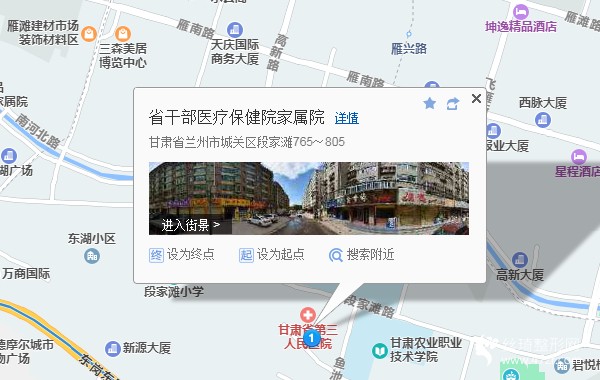 蘭州站340米向北步行 到 蘭州車站9站乘 110路 (東崗鎮(zhèn)方向) 到 省第三人民醫(yī)院(段家灘)230米向西南步行 到 省干部醫(yī)療保健院家屬院