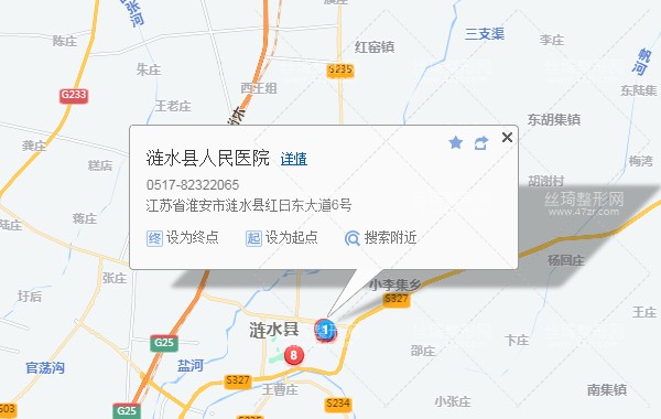 漣水高鐵站110米向西南步行 到 高鐵站廣場16站乘 漣水606路 (漣水汽車站方向) 到 縣醫(yī)院西門200米向南步行 到 淮安漣水縣人民醫(yī)院燒傷整形科