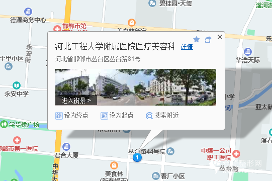 邯鄲站170米向東南步行 到 火車站12站乘 9路 (爆臺寺方向) 到 光明大街叢臺路口350米向西北步行 到 河北工程大學附屬醫(yī)院醫(yī)療美容科