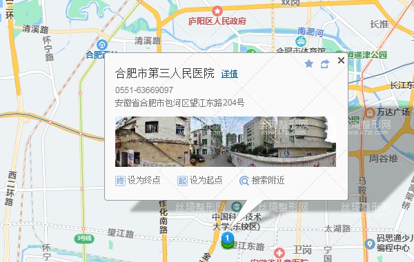 合肥站120米向西步行 到 合肥火車站 A口 進站6站乘 軌道交通1號線 (九聯(lián)圩方向) 到 朱崗 C口 出站590米向東步行 到 五里沖4站乘 B2路 (中科大先研院方向) 到 南七里510米向東步行 到 合肥市第三人民醫(yī)院美容整形門診