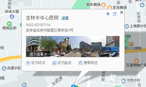 吉林站410米向西步行 到 吉林站西廣場(chǎng)5站乘 1路 (農(nóng)林街方向) 到 南京街150米向東北步行 到 吉林市中心醫(yī)院