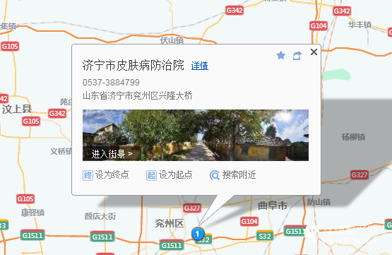 濟(jì)寧汽車總站120米向北步行 到 汽車南站7站乘 K85路 (匯翠園B區(qū)東門方向) 或 4路 到 汽車北站190米向東步行 到 濟(jì)寧汽車北站1站乘 泗水商務(wù)快線 (泗水汽車站方向) 到 兗州汽車站190米向東步行 到 火車站廣場(chǎng)9站乘 兗州2路 (興隆莊煤礦方向) 到 濟(jì)寧皮防院210米向西步行 到 濟(jì)寧市皮膚病防治院