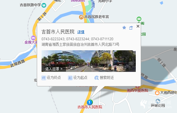 吉首站170米向東南步行 到 火車站3站乘 1路 (木林坪方向) 或 吉首1路 到 步行街2米向東步行 到 湘泉步行街1站乘 1路支線 (木林坪方向) 到 武陵山40米向西南步行 到 吉首市人民醫(yī)院