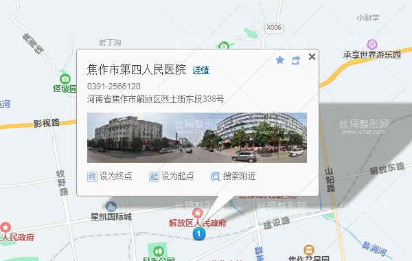 焦作市汽車客運總站260米向西北步行 到 客運總站9站乘 7路 (萬方鋁廠方向) 到 二醫(yī)院800米向北步行 到 焦作市第四人民醫(yī)院,