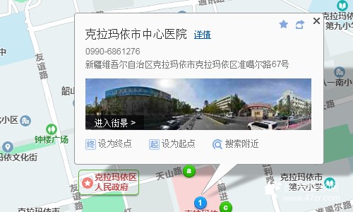 克拉瑪依站120米向東步行 到 火車站15站乘 12路 (星光停車場(chǎng)方向) 到 通運(yùn)大廈510米向西步行 到 克拉瑪依市中心醫(yī)院燒傷整形科