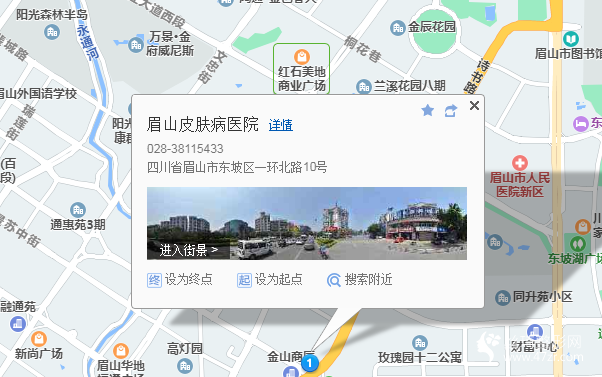 眉山站1.2公里向東步行 到 眉山東站6站乘 10路 (千禾大道(鄭店子)方向) 到 北門(mén)詩(shī)碑170米向西北步行 到 眉山皮膚病醫(yī)院