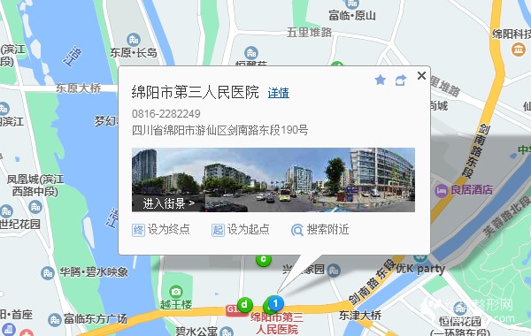 綿陽站460米向東南步行 到 臨園路西段7站乘 99路 (萬鴻生態(tài)頤養(yǎng)園方向) 或 3路 到 三醫(yī)院100米向西步行 到 綿陽市第三人民醫(yī)院