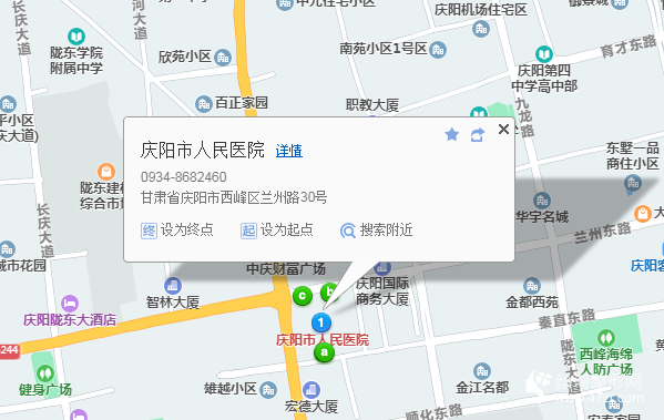 慶陽站560米向東南步行 到 物流中心7站乘 4路 (周祖廣場方向) 到 人壽保險公司490米向東步行 到 慶陽市人民醫(yī)院