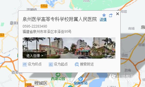 泉州站1.1公里向東南步行 到 泉州軟件園(北)27站乘 X1路 (泉州五中城東校區(qū)方向) 到 豐云路50米向東步行 到 泉州醫(yī)學(xué)高等??茖W(xué)校附屬人民醫(yī)院