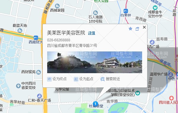 成都站100米向西步行 到 火車北站 H口 進(jìn)站3站乘 地鐵1號線 (科學(xué)城方向) 到 騾馬市130米向東步行 到 騾馬市3站乘 地鐵4號線 (萬盛方向) 到 草堂北路 B口 出站880米向南步行 到 美萊醫(yī)學(xué)美容醫(yī)院,