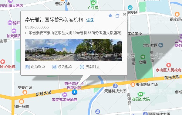 泰安站310米向東南步行 到 高鐵泰安站1站乘 游4路 (寶泰隆旅游度假區(qū)方向) 到 泰山火車站1.1公里向東步行 到 泰安雅汀國(guó)際整形美容機(jī)構(gòu),