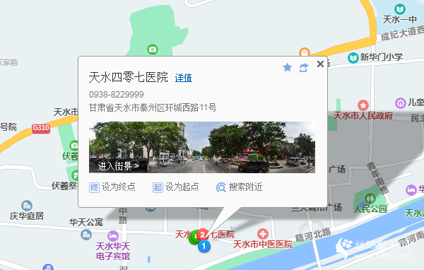 天水站120米向南步行 到 火車站2站乘 1路 (秦州公交站方向) 或 58路 麥積55路外環(huán) 37路 到 盤旋路160米向東步行 到 麥積高速路口2站乘 6路 (秦州公交站方向) 到 市委黨校9米站內(nèi)換乘 18路外環(huán)8站乘 18路外環(huán) (天水賓館北方向) 到 四〇七醫(yī)院30米向西步行 到 天水四零七醫(yī)院