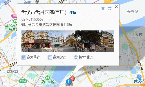 武漢站60米向東北步行 到 武漢火車站 西入口進站7站乘 軌道交通4號線 (柏林方向) 到 岳家嘴120米向東步行 到 岳家嘴3站乘 軌道交通8號線 (金潭路方向) 到 徐家棚 R口 出站110米向東步行 到 和平大道徐家棚1站乘 549路 (和平大道建設二路方向) 或76路 到 和平大道四美塘810米向北步行 到 武漢市武昌醫(yī)院(西區(qū))