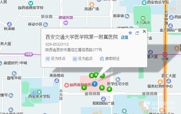 西安站南廣場290米向南步行 到 火車站1站乘 201路 (西辛莊方向) 或 251路 5路41路 500路 到 五路口240米向東步行 到 五路口 B口(西南口)進(jìn)站5站乘 地鐵4號線 (航天新城方向) 到 大雁塔90米向東步行 到 大雁塔2站乘 地鐵3號線 (魚化寨方向) 到 吉祥村 D口(東北口) 出站690米向東南步行 到 西安交通大學(xué)醫(yī)學(xué)院第一附屬醫(yī)院