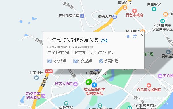 百色站470米向西南步行 到 福源苑15站乘 8路內(nèi)環(huán) (中天大酒店方向) 到 百家匯市場240米向東步行 到 右江民族醫(yī)學(xué)院附屬醫(yī)院