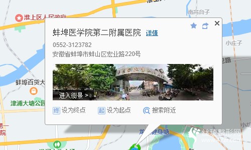 蚌埠長途汽車站530米向北步行 到 解放二路·長城醫(yī)院5站乘 222路 (鳳陽金星實(shí)業(yè)方向) 到 黨校龍湖新天地810米向西步行 到 蚌埠醫(yī)學(xué)院第二附屬醫(yī)院整形外科