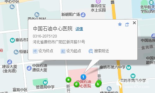 廊坊站750米向北步行 到 廊坊北站東廣場4站乘 12路 (大學(xué)城方向) 到 管道局醫(yī)院40米向南步行 到 中國石油中心醫(yī)院