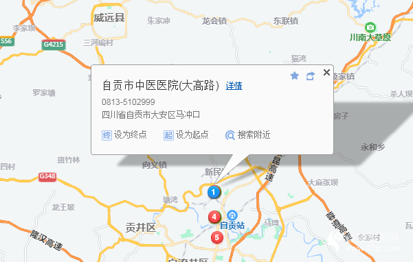 自貢站750米向西步行 到 龍井7站乘 42路板倉直行車 (馬沖口方向) 到 馬沖口10米向西步行 到 自貢市中醫(yī)醫(yī)院(大高路)