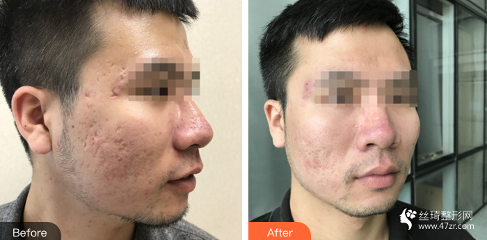 長期痘痘未清理形成的痘坑,前期先大面積清理痘痘,再通過療程點(diǎn)陣的方法改良面部痘坑及疤痕情況。