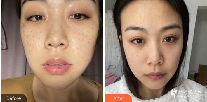 斑點(diǎn)已經(jīng)困了我好多年啦 現(xiàn)在終于鼓起勇氣來弄它們了。其實(shí)挺害怕的,但是一直因?yàn)槟樕嫌邪?,而且一年比一年?yán)重,心里真不是滋味。用過很多祛斑的產(chǎn)品,都沒有用。照了皮測,醫(yī)生說是混合性色素斑。今天剛做了一次,做的時(shí)候眼睛被罩住的,只感覺臉上刺刺熱熱的,然后做完交待了一些注意事項(xiàng),就輕松結(jié)束了?,F(xiàn)在還沒看出來果