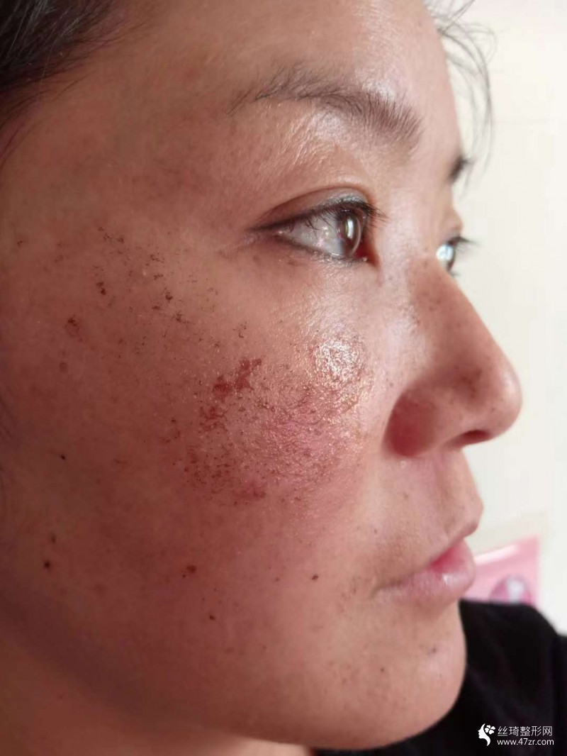 有點(diǎn)癢癢的,但是我不會(huì)用手去碰它的,因?yàn)椴缓?,?duì)吧,對(duì)自己的皮膚不好,誰會(huì)做呢,早上起來照鏡子,用手一摸,全部結(jié)痂,但是忍住沒有撓,現(xiàn)在的面部,像是罩了個(gè)殼子,這個(gè)殼子脫落后,就是我美麗光滑的臉啦,醫(yī)院叮囑現(xiàn)在不要化妝,也是我自己的斑年頭太久了,所以創(chuàng)口有點(diǎn)深,完全恢復(fù)大概還要十多天吧。