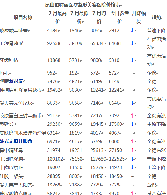 昆山鉑特麗醫(yī)療整形美容醫(yī)院價(jià)格表