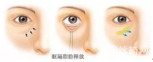 眶隔脂肪釋放術(shù)是先將眶隔內(nèi)的脂肪釋放出來(lái),將它填塞固定在已經(jīng)分離好的眶下骨膜上,使凹陷平整。并同時(shí)修復(fù)加強(qiáng)眶隔筋膜,繼而懸吊松弛的眼輪匝肌到眶骨骨膜上,然后去除多余皮膚。